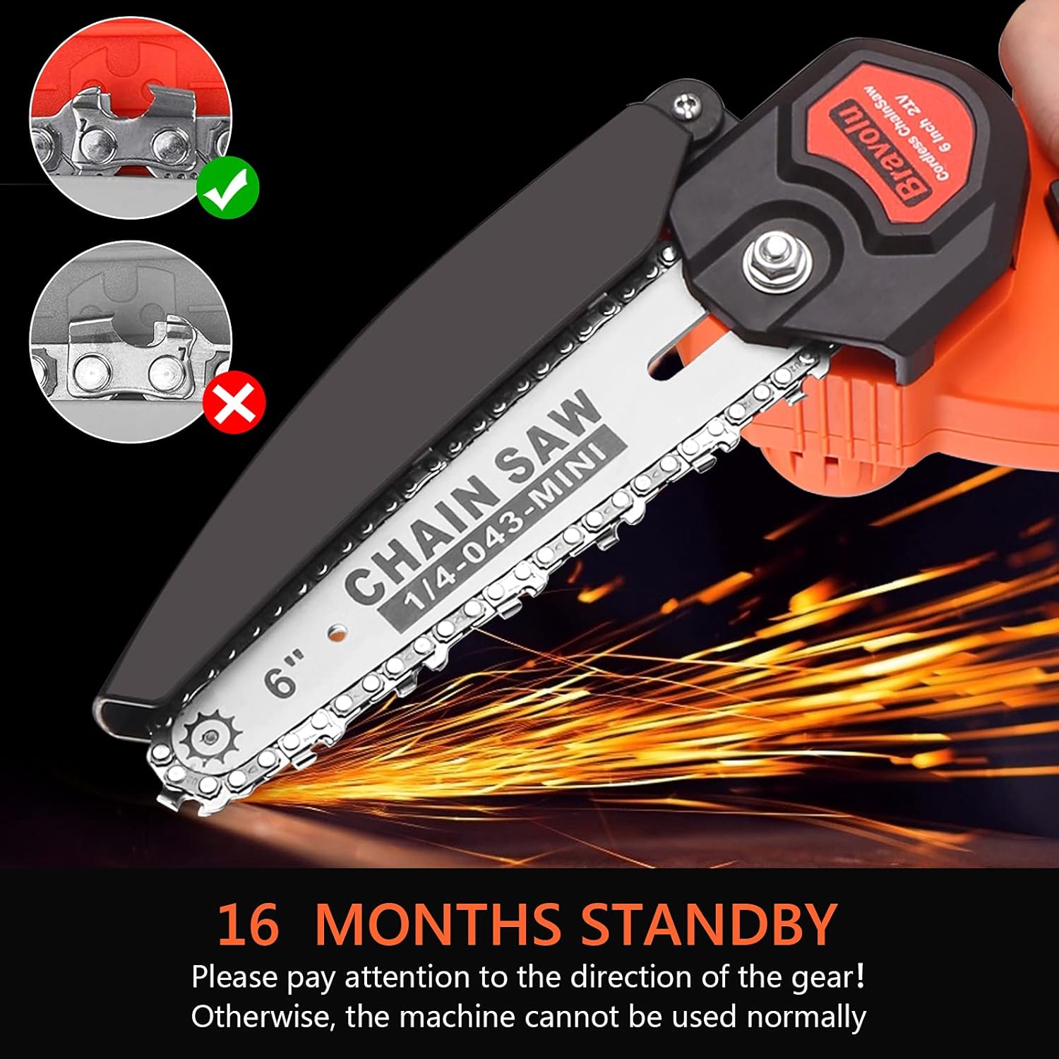 【Easy Install and Operate】Bravolu mini chainsaw cordless has been installed and included (1 *Host, 1 x Lubricating oil, 2 *chains, 2*batteries, 1* gloves, 1 *Hexagonal wrench, 1*Screwdriver, 1*Plug charger, 1 *User Manual), just adjust the screw tightness before use It can be used when the battery is fully charged. Equipment maintenance only needs simple oiling and wiping.